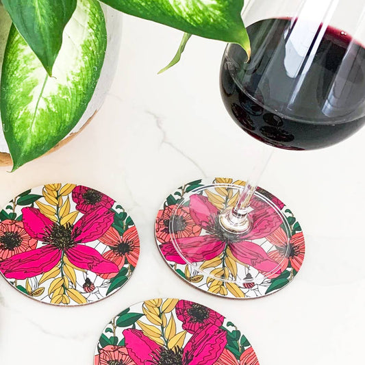 Bean and Bemble Coasters Box Set Round Melamine Wood Vivid Garden Blooms Floral
