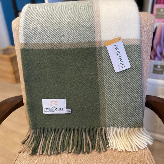Tweedmill Block Check Wool Throw Blanket Olive