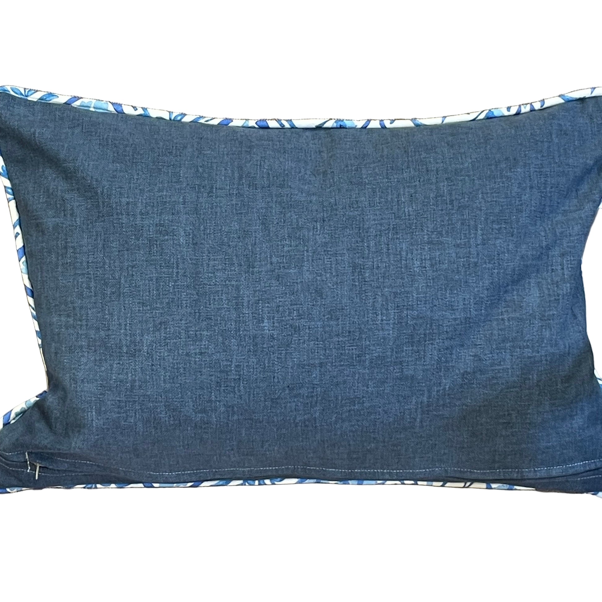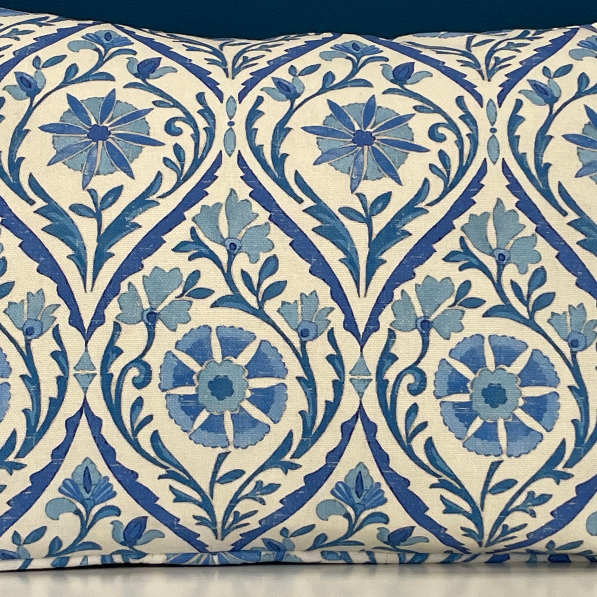 Handmade cushion made with Iliv's Suhani Batik fabric featuring an intricate blue-and-white floral and vine pattern that evokes the elegance of hand-dyed batik. The edge of the cushion is trimmed with piping and the back of the cushion is made with Oslo Oxford, a deep denim blue which adds a stunning contrast to the floral pattern. The cushion measures 14" x 20" (35cm x 50cm) and comes complete with a feather insert.