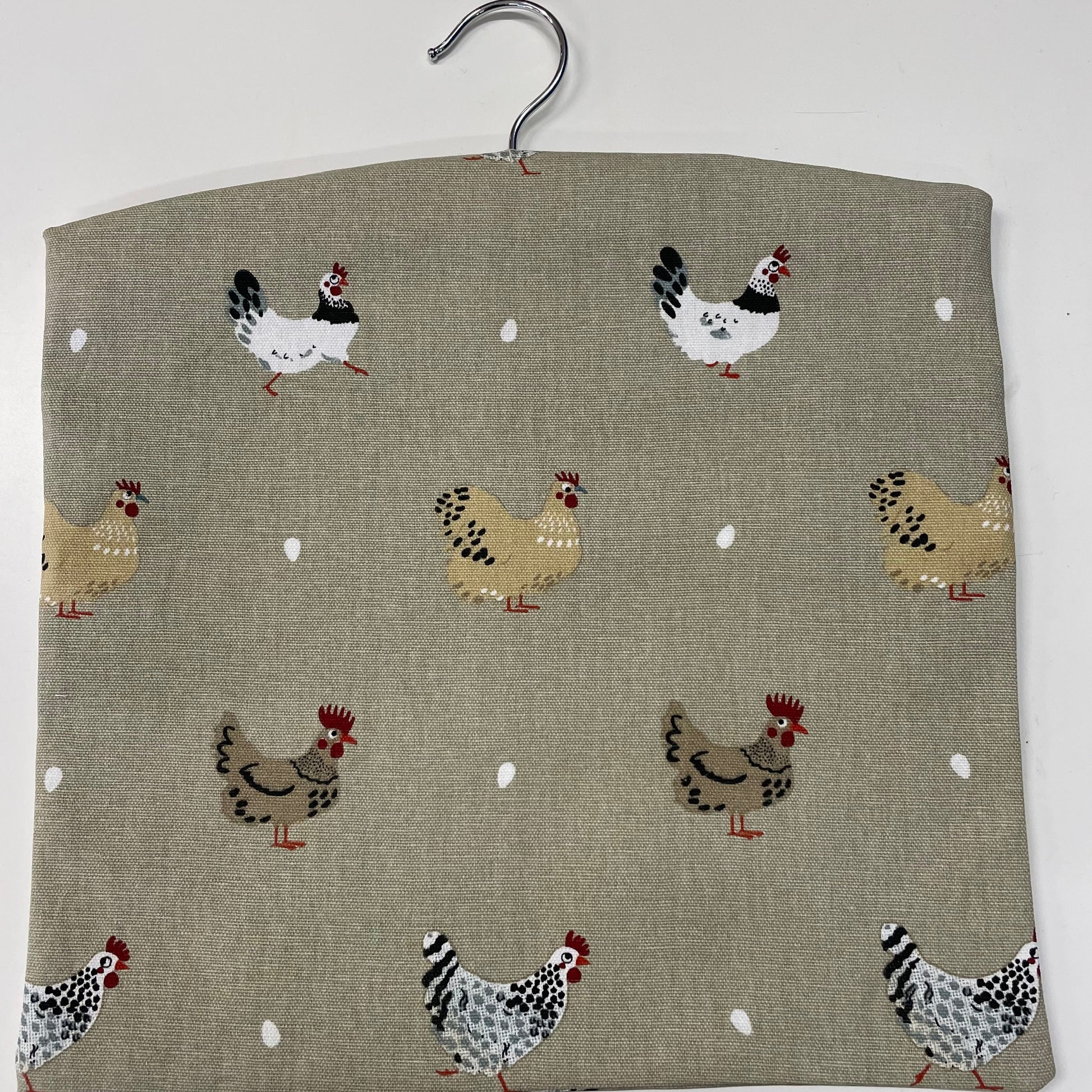 Raspberry Leaf Interiors handmade fabric Peg Bag made with Sophie Allport Chicken fabric featuring five different chickens on a beige background. The fabric peg bag comes complete with a sturdy removable wooden hanger so you can hang your washing outside on a washing line or indoors clothes airer. A beautiful country style design that would make a practical home warming gift too! Measures approximately 31cm long x 32cm wide, with plenty of room for storing your clothes pegs!