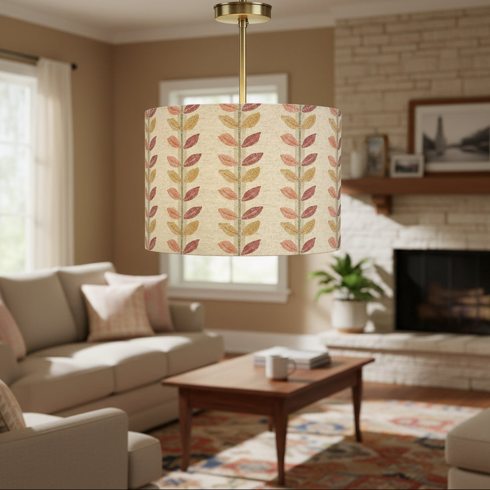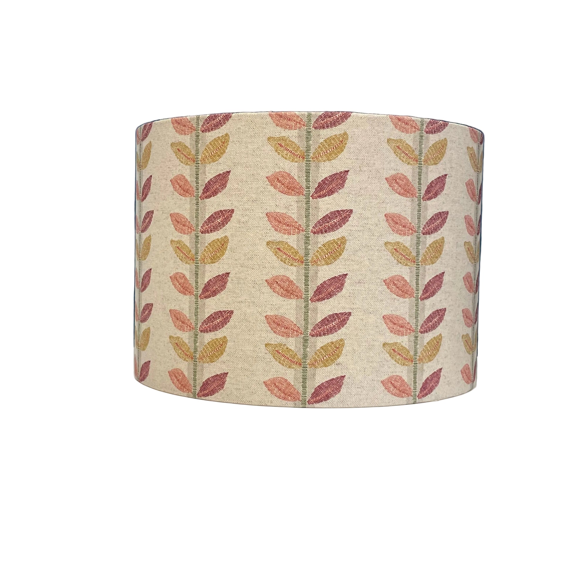 Raspberry Leaf Interiors handmade lampshade, 30cm made with Lily Raspberry Fabric from Prestigious Textiles new Pippin Collection. This fabric features a joyful parade of leaves in raspberry, blush, mustard, and sage on a neutral linen background, bringing playful colour and charm to your home. This drum lamp shade fits easily from a ceiling light fitting and measures 30cm wide x 21cm high.