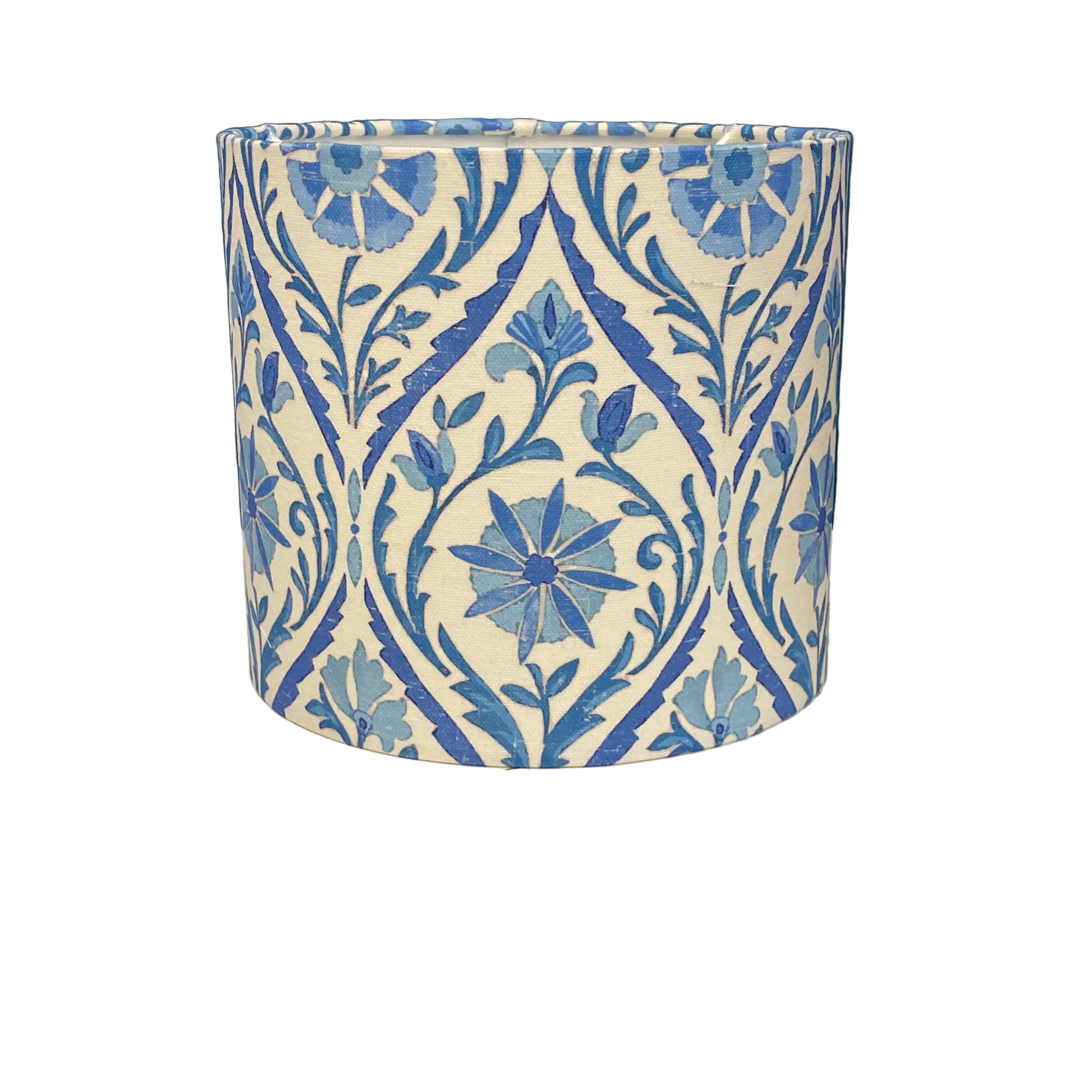Raspberry Leaf Interiors handmade lampshade, 30cm made with Suhani Batik fabric featuring an intricate blue-and-white floral and vine pattern that evokes the elegance of hand-dyed batik. This drum lamp shade fits easily from a ceiling light fitting and measures 30cm wide x 21cm high.